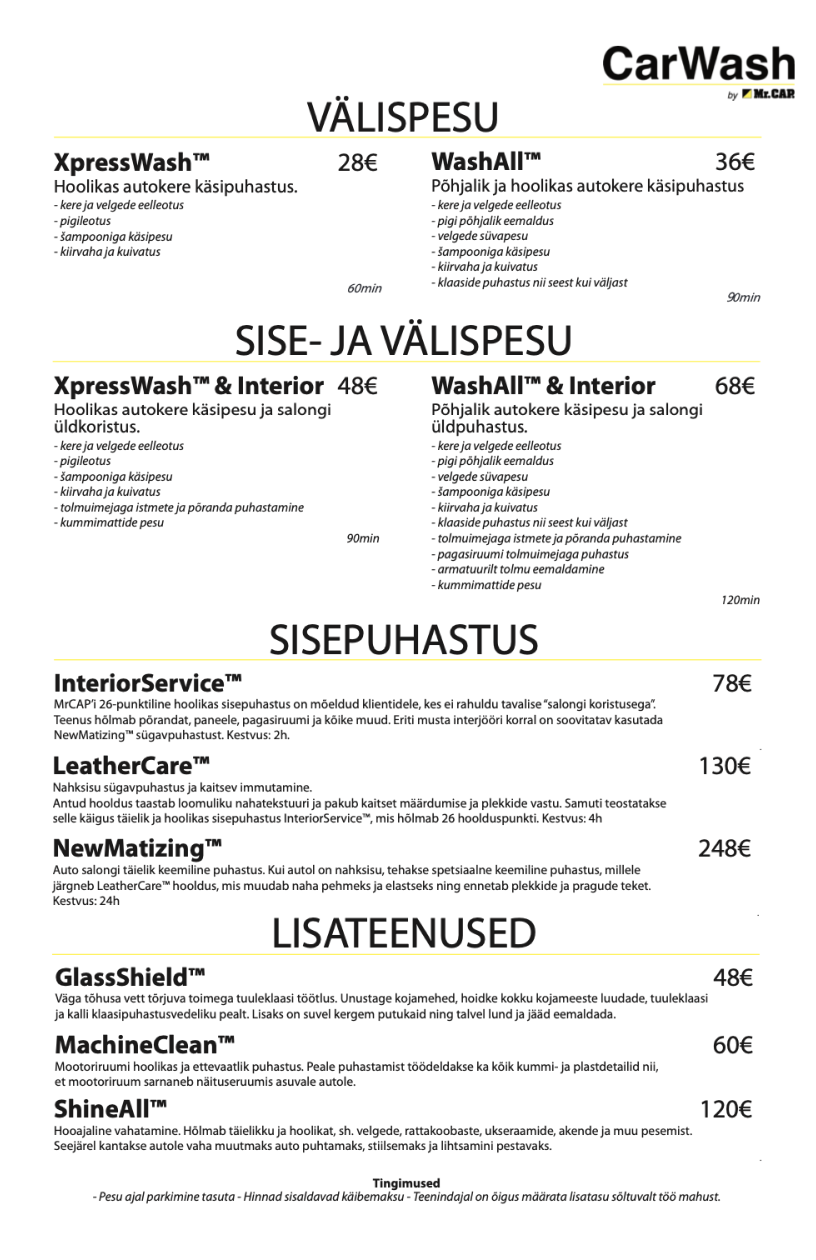 Kui otsite enda autole kvaliteetset välispesu, sisepesu, mootori puhastust, tuuleklaasi töötlust või vahatamist, siis olete õiges kohas. Kõikide teenuste puhul kasutame kvaliteetseid MrCAP tooteid.